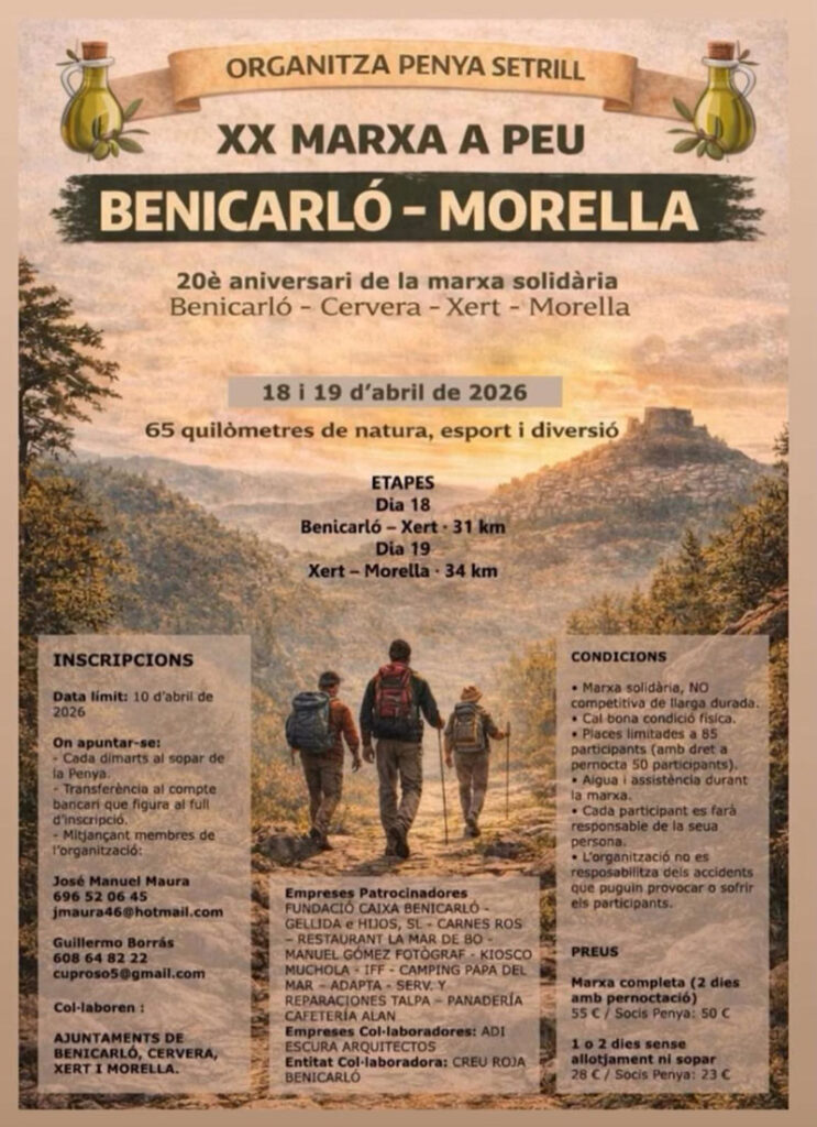 La Penya Setrill organitza els dies 18 i 19 d’abril de 2026 la XX Marxa a Peu Benicarló – Morella, commemorant el 20è aniversari de la marxa solidària Benicarló – Cervera – Xert – Morella. L’esdeveniment proposa un recorregut de 65 km de natura, esport i diversió, repartits en dues etapes: